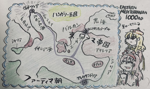 #世界史 #アナログ絵 #アナログイラスト 「みずのなかにいる!」 東方交易!奢侈品が欲しいヨーロッパ、原料や銀貨が欲しいオリエント。両世界の相補関係を上手く取り結ぶことで、巨万の富が約束されるのでした。イラストは、東地中海一帯の概略図。本当はもっといっぱい島があります。
