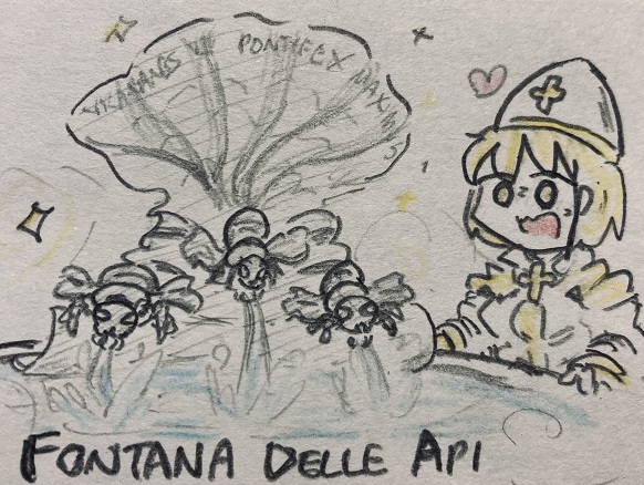 #世界史 #アナログ絵 #アナログイラスト 世界史みつばち小噺「蜂の噴水」 1644年、教皇ウルバヌス8世のリクエストで彫刻家ベルニーニが製作した、蜜蜂をかたどった噴水。蜜蜂は名門バルベリーニ家の紋章でもあり、かの家の出身だったウルバヌス8世は、至る所に蜜蜂のシンボルを刻印させていたとか。
