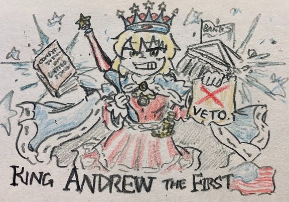 4 17 #世界史 #アナログ絵 #アナログイラスト 世界史小噺「国王アンドリュー1世」 中央銀行の免許更新に対し拒否権(Veto)を行使するなど、19世紀初期のアメリカ財界にメスを入れたアンドリュー・ジャクソン大統領。当時、彼を自由を蝕む専制君主に見立てた風刺画が大量に出回ったそうです。 23/02/23 19:06