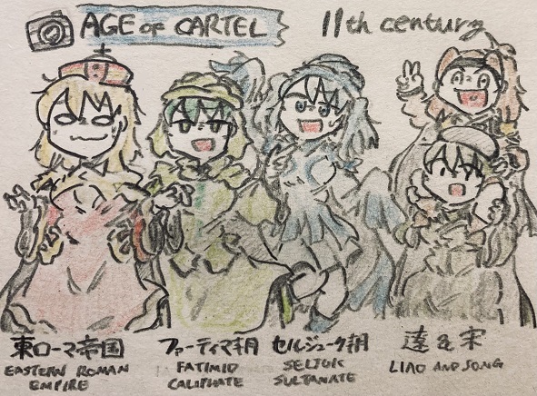 4 11 #世界史 #アナログ絵 #アナログイラスト 「大帝国集合写真」 11世紀に撮った集合写真!東ローマ帝国とファーティマ朝が手を結び、宋が遼を肩車する…というように、東西それぞれで帝国同士が政治的・経済的な紐帯を形成していた時期です。セルジューク朝は最強にして孤独…なのかな? 23/03/16 19:23