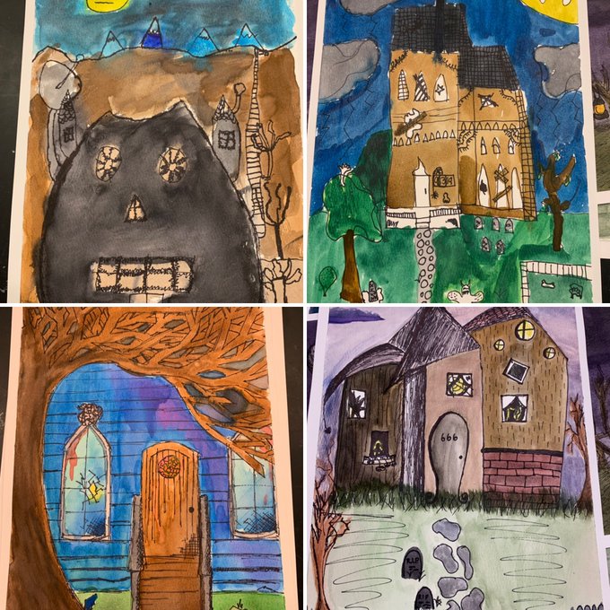 Spooky Halloween vibes coming at ya from grade 6 Art studio! #penandink #inktober #medfieldps #bmsed #watercolor