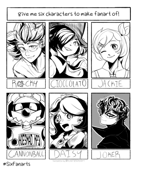 i can fINALLY post my #SixFanarts since my bro @2DXRAKKII came out w his rad oc rocky and cannonball! i also drew @pankc4's oc cio, and @OtakuPrincessCJ jackie! also daisy from the mario series and joker from persona5! these characters were hella fun to draw! glad i got to draw m