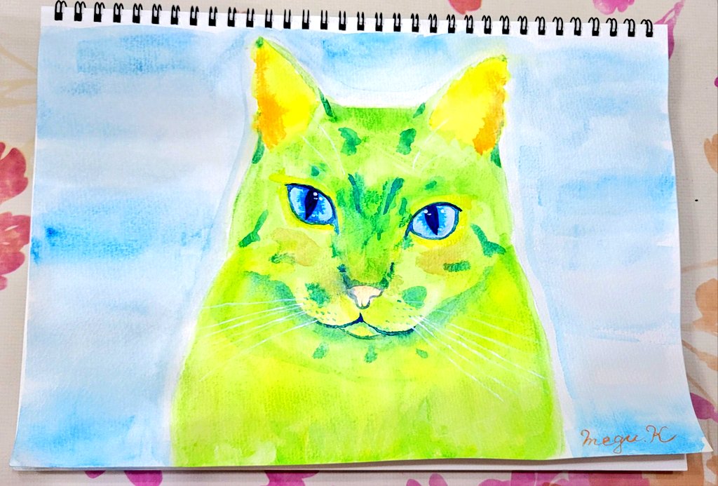 Green cat LINEスタンプ用に描きました🎶 #イラスト #art #絵画 #猫 #動物 #leaf #葉 #緑 #Pop #オリジナル #アナログ #手描き #水彩 #アクリル #絵の具