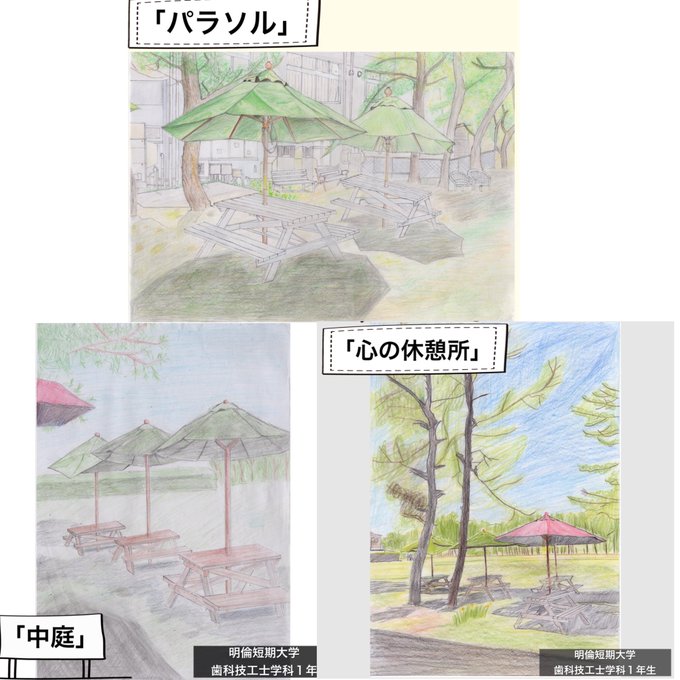 1 5 5月に #歯科技工士学科 1年生が描いた #色鉛筆画 紹介しています テーマが「大学の生活」で同じ場所を選んだ学生さんいるのですが、違う見方をして個性が出ています。 インスタに他の色鉛筆画も載せているのでぜひご覧ください↓ instagram.com/meirindt/?hl=ja 22/01/14 11:14