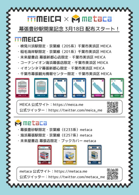 京葉線 幕張豊砂駅 開業記念! / #MEICAカード&#metacaカード 3月18日 配布開始✨ \ ①幕張豊砂駅 ②海浜幕張駅 ③検見川浜駅 ④稲毛海岸駅 ⑤未来屋書店幕張新都心店 ⑥未来屋書店幕張店 ⑦コーナンイオン海浜幕張店 ⑧イオンシネマ幕張新都心 ⑨千葉市幕張観光情報センター 詳細はスレッドで👇