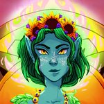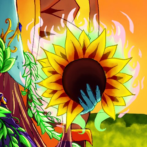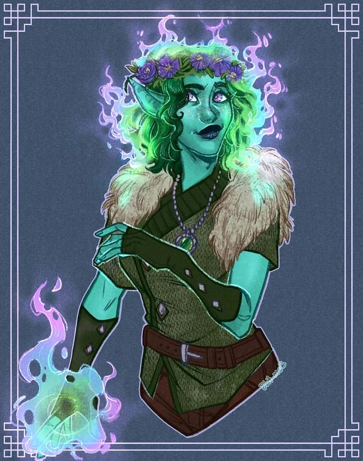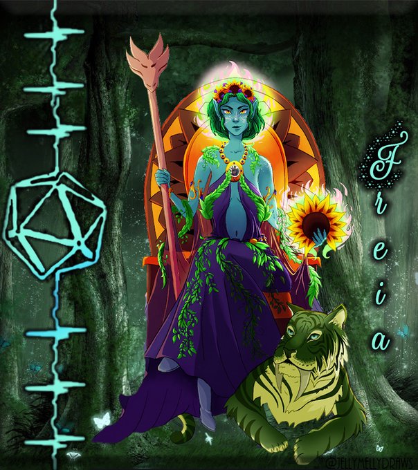 Tell me about your favorite #DnDcharacter! This is Queen Freia Amastasia of Darkwind. She is a woodelf wildfire druid with a bad habit of setting everything on fire. She loves mushroom soup and sunflowers! art by @JellyMellyDraws #DnD #ttrpgfamily #TTRPGs #dnd5e #dndart