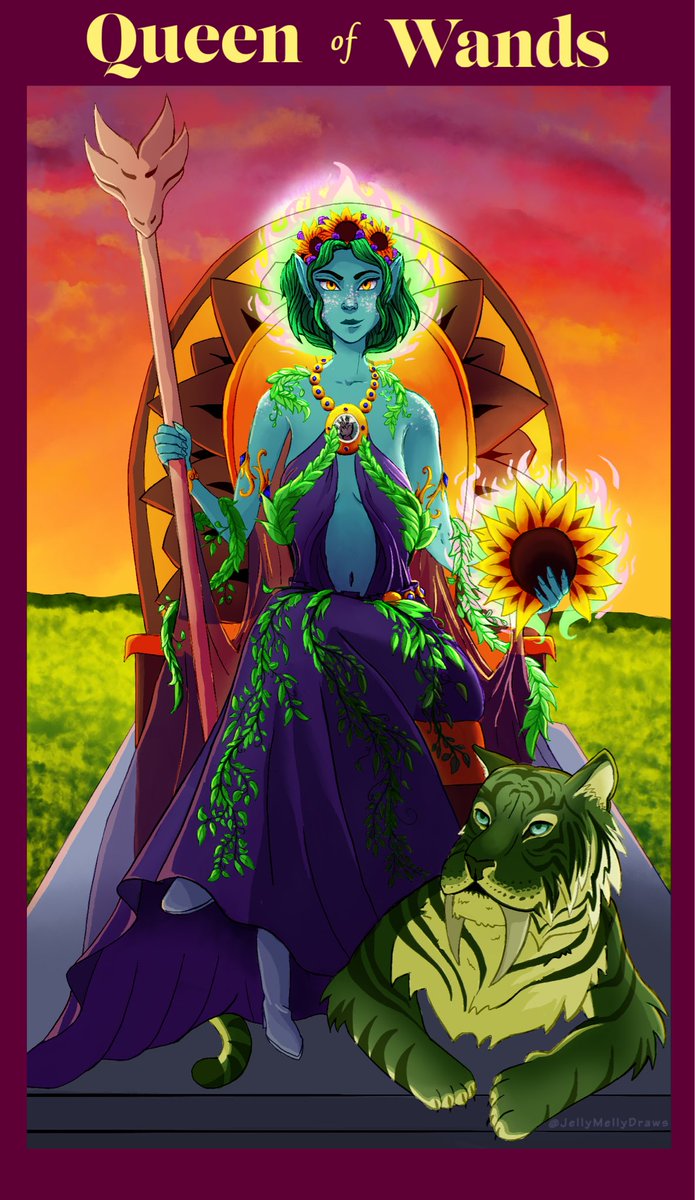 My newest art of Queen Freia as the Queen of Wands. Artist cred: @JellyMellyDraws. Thoughts? Fun fact: Freia's family name "Amastasia" means sunflower! #dnd5e #DnD #DnDcharacter #dndart #dndart #ttrpg #ttrpgfamily #ttrpgsolidarity #TTRPGRising