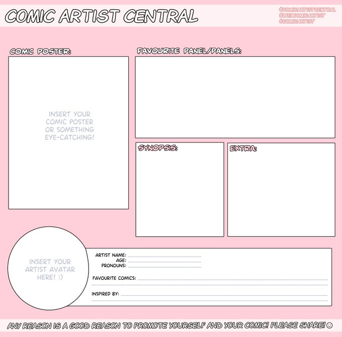 Sure thing!! Thanks for sharing!! #comicartistcentral is for you as a comic artist to go wild with promoting yourself and your comic! If you need a template to work from, here are some basic ones you can use! Edit them as much as you want! 😎 be creative! tumblr.com/captainmera/71… twitter.com/byelacey/statu…