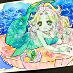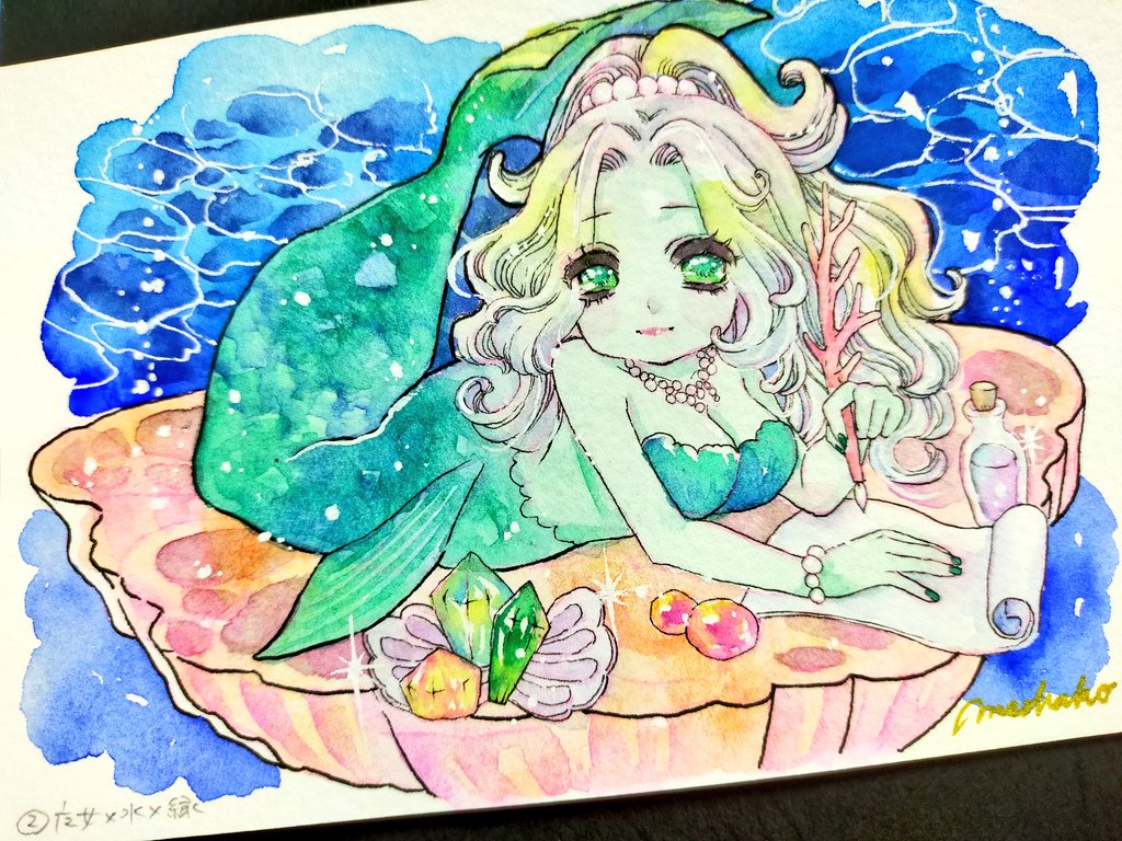 #ルーレットで絵を描こう ②魔女×水×緑 遅刻すみません🙇♀️💦お題を見た時に、昔読んだ人魚姫の絵本の、悪い海の魔女が思い浮かんだので描いてみました…全然悪くなさそうな顔になっちゃいましたが😂鱗だけでなく、お肌も緑で塗っています💚 遅ればせながら、これからタグ巡回します🎶
