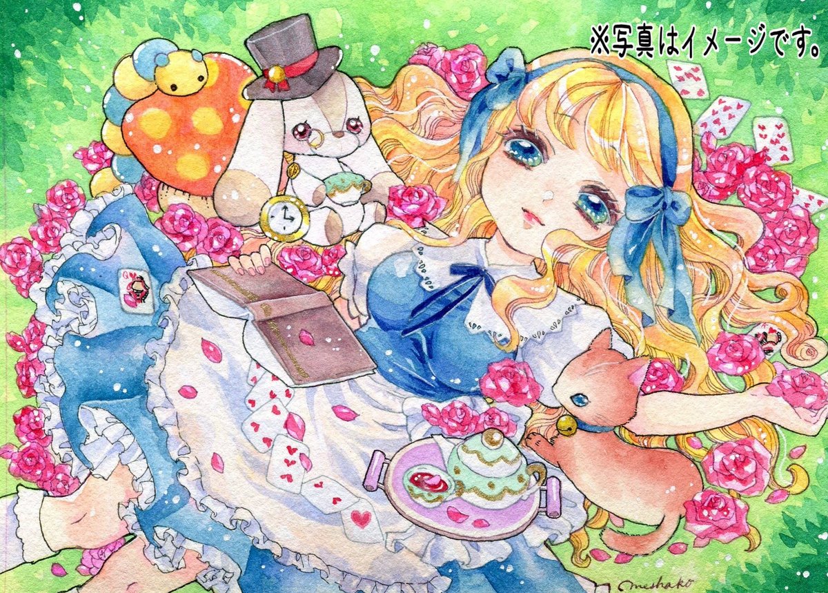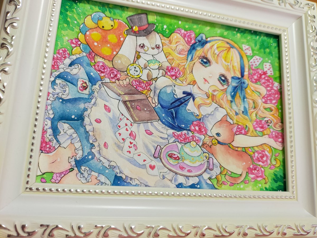 #グラッドアリス展2 「午睡は薔薇の香り」 やわらかな木漏れ日の中、不思議の世界へ誘い込まれてしまう、夢うつつのアリスを描きました。ポールルーべンスの水彩紙できらめき、白い額と合わせて上品に仕上がったので、ぜひ実物をご覧ください💕 twitter.com/Meshako_/statu…