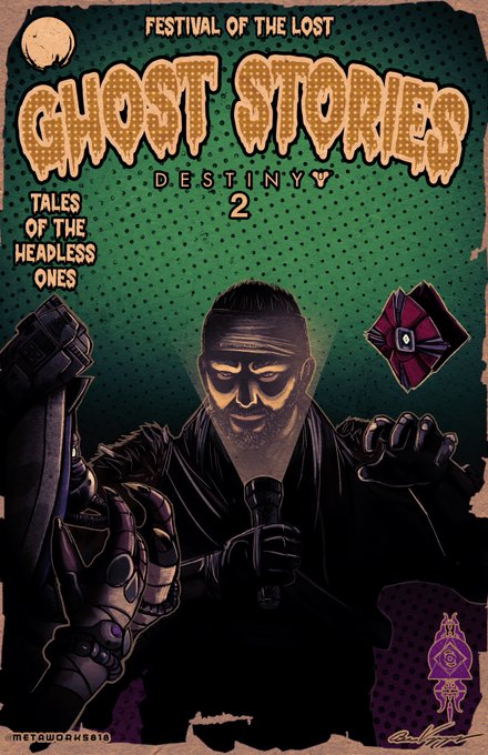 "You best start believing in ghost stories. You're in one!" Glint and Drifter telling ghost stories to Eido for her first Festival of the lost. Went for a pulp horror comic vibe. #AOTW #Destiny2Art #FOTL @Bungie @DestinyTheGame @A_dmg04 @DirtyEffinHippy @TheSamBartley