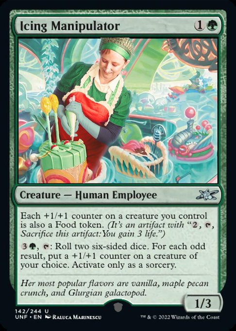 "Her most popular flavors are vanilla, maple pecan crunch, and Glurgian galactopod" I had trouble sourcing Glurgian galactopods, but otherwise did my best to replicate this Unfinity cake! #mtg #mtgcosplay #mtgbaking #unfinity