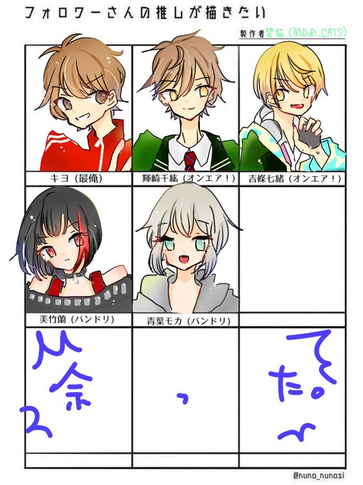 #フォロワーさんの推しが描きたい 五人ほど描かせていただきました〜! 普段描かないキャラが描けて楽しかった😊😊 キヨ さん (最俺) 輝崎千紘 くん (オンエア!) 吉條七緒 くん (オンエア!) 美竹蘭 ちゃん (バンドリ!) 青葉モカ ちゃん (バンドリ!) です〜〜