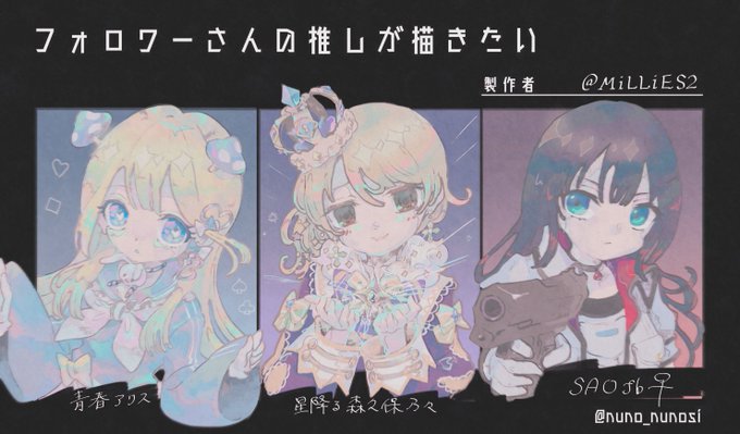 19 59 🍁芸術の秋きゃんぺ~ん #フォロワーさんの推しが描きたい 青春アリス、もりくぼ、SAOFBの女主人公ちゃんです。 ありがとうございました🪄 21/09/04 12:25
