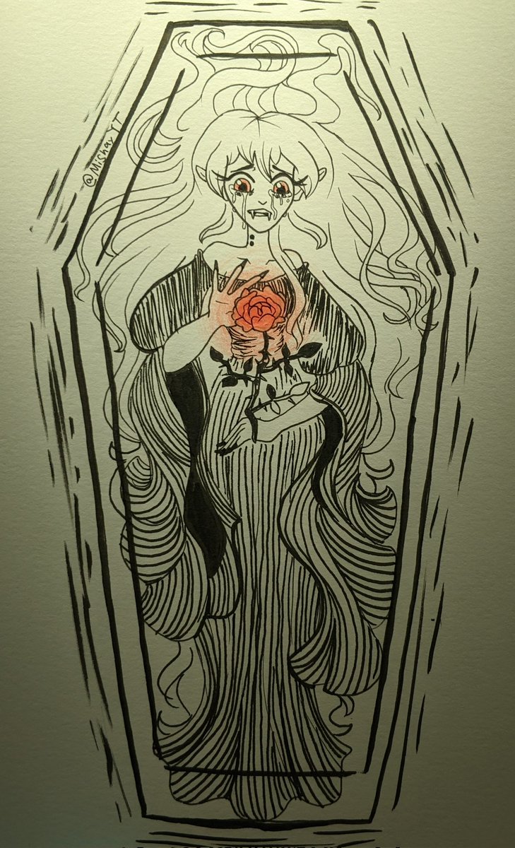 Inktober Day 16: Rose A vampire would be buried with a rose on top of their coffin to keep them from leaving their grave. The vampire looks at the rose and becomes mournfully memorized by it. It is a reminder of how beautiful and quick life can be. #inktober2021 #Vampire #rose