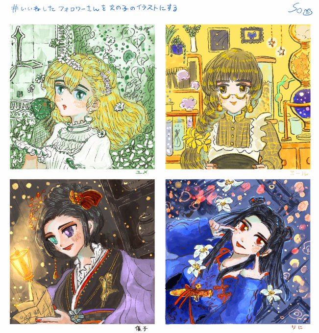 #いいねしたフォロワーさんを女の子のイラストにする ユメさん みどりに心を奪われ、人知れず永遠を刻む。 ミールさん 癒しと観測で迷い人を導く。 優子さん 希望溢れる開拓をし、未来を創る。 りにさん 家宝をこっそり持ち出し、家出したお姫様。