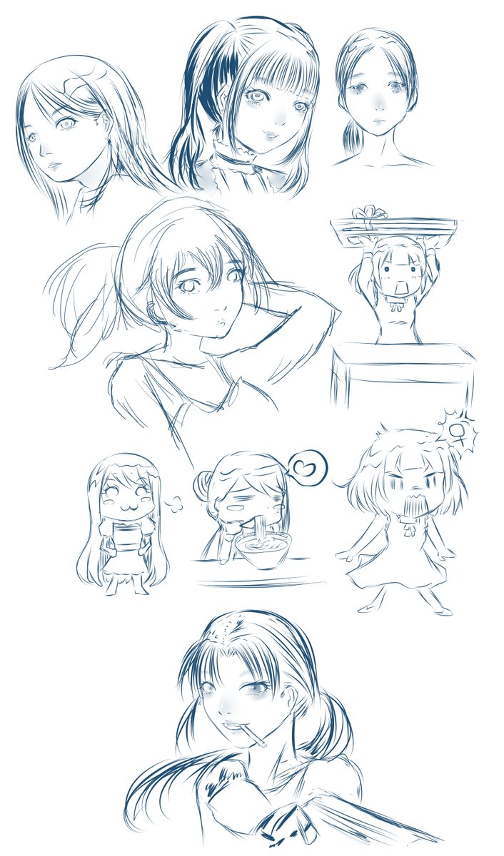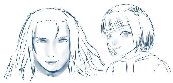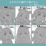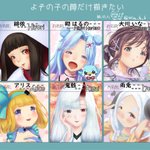 wip #よその子の顔だけ描きたい の線画まで出来上がりました。 協力頂いている方々のツイッター↓ 左上から ラッコちゃんさん(@ra_cco) 砌はるのさん(@migiri_haruno) 五七翔二さん(@goshichi_shoji) Hirosanさん(@Hirosanx) 白玉茶杜さん(@shira_otama) かがりさん(@uni_uni_Kagari)