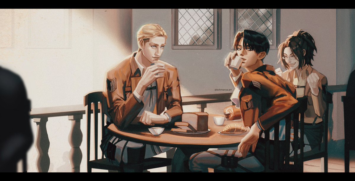 A day of Erwin & Levi - part 1 . #attackontitan #aot #erwinsmith #leviackerman #hangezoe #erwin #levi #hange #fanart #breakfast #morning #procreate #surveycorps