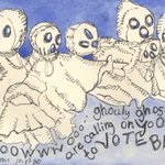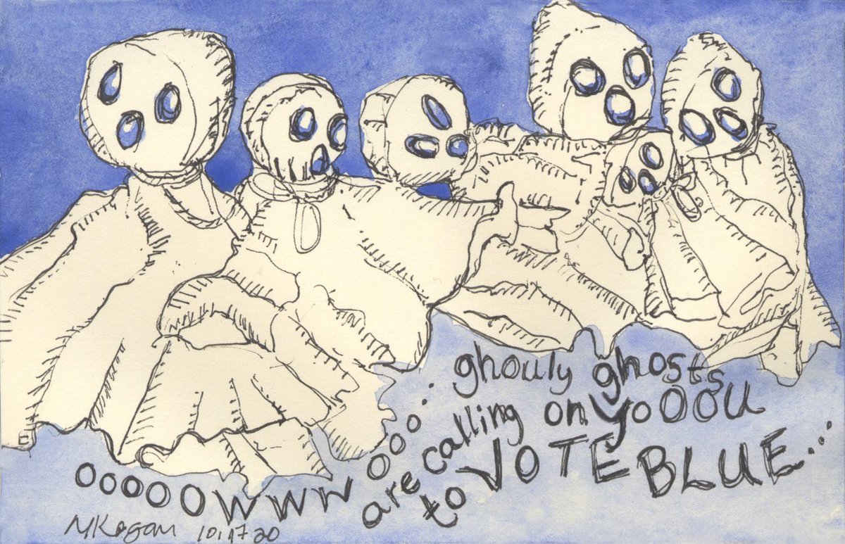 #Inktober2020 day18 and #Haiku oooOOWWwooo… ghouly ghosts are calling on yooou to vote BLUE… © 2020 Michelle Kogan #kidlitart #artist #VOTE #pen #watercolor #ghosts #Halloween #justice