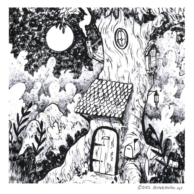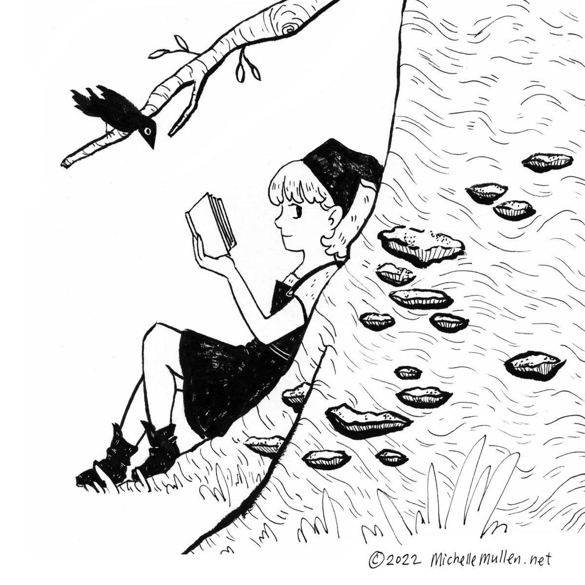 05 | MUSHROOMS Noemi's favorite reading spot is right next to the tree with mushrooms growing on it. #inktober2022 #Drawlloween2022 #illustration