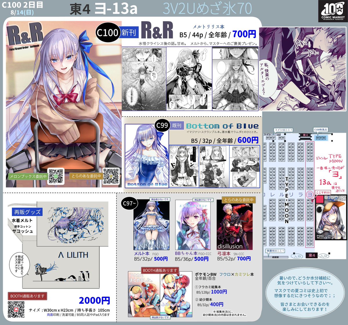 【お品書き】 明日(C100 2日目 8/14(日)) のお品書きになります~!!! 新刊はメルトリリス本です🐧 マスクでの夏コミケは恐らく史上初で きつい一日になりそうなので、 どうか充分な水分補給やタオル、もろもろ熱中症対策していらしてくださいね...!!! 東4 ヨ-13aでお待ちしてます~!