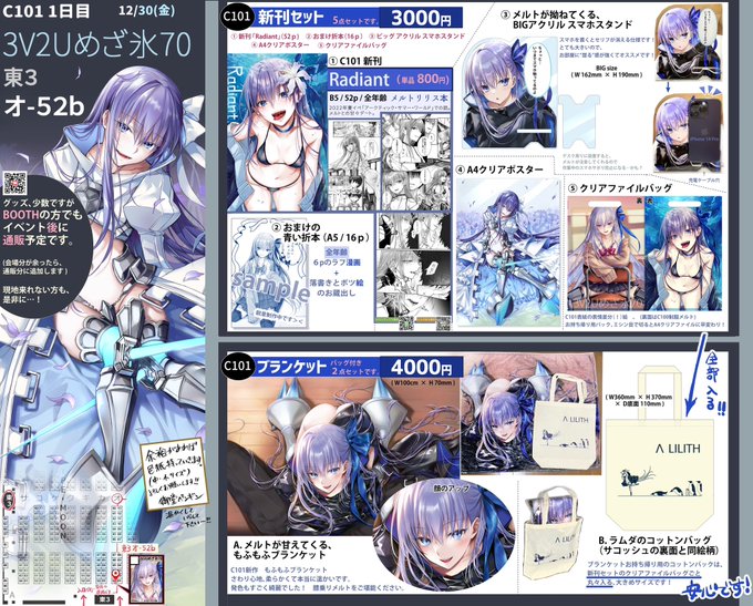 104 258 【C101お品書き】 こちらの垢でも貼っておきます🙌 メルト尽くしです。 明日30日はどうぞよろしくお願い致します😭🙏 水分や防寒を充分に備えていらして下さい〜。 場所は、オ52b、 東3ホールの入り口すぐで、お隣が刀剣乱舞のサークル様という、ジャンル型月の最端のスペースでお待ちしております。 22/12/29 14:31