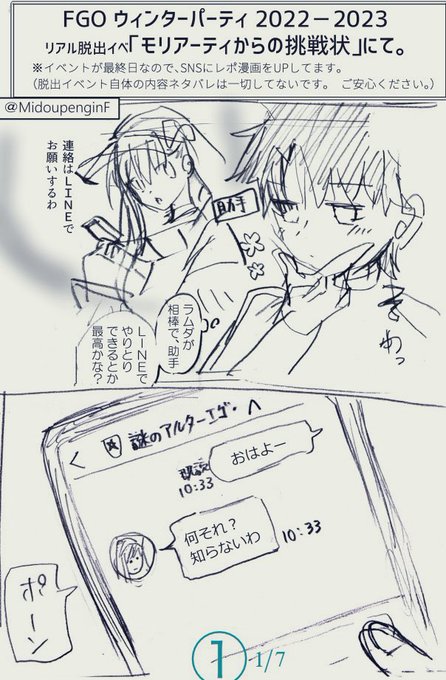 液タブ修理中で、雑なアナログ漫画(7p)ですが、 FGOの脱出イベ「モリアーティからの挑戦状」が最高だったので描きました🙏✨ (内容一切触れてないので ネタバレなし) 一応まだWinter Party公式ページから「若モリ挑戦状」OP動画がまだ見れますので、動画の最後にあるQRで友達登録してLINEできます💪