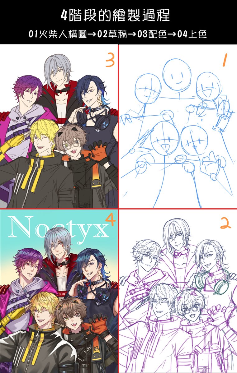 #FulGallery #VioletAtelier #AsumArt #Briskart #AlbanKnoxArt Noctyx出道邁入第2個月啦!恭喜!♥♥ 謝謝成員們帶給我不少的歡樂, 很喜歡聽到他們的笑聲, 會忍不住跟著一起笑(*´▽`*) 默默的畫一張全體成員當賀圖, 很久沒有以草稿方式直接上色, 很多地方沒有細刻, 就不把圖放太大了(*´艸`*)