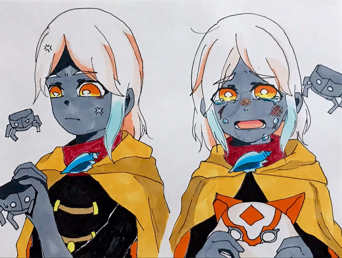 #sky星を紡ぐ子どもたち #絵描きさんと繋がりたい #オリキャラ (⚠️顔あり) [カイくん髪の毛下ろしバージョン] 左はカニに2回体当たりをくらってイラついてるカイくんで、右がカニに凄い沢山体当たりをくらって泣いてるカイくんです(^ω^) これでも一応、男の子なんですよ(