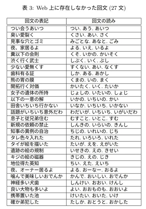 文節結合による回文の自動生成 ai-gakkai.or.jp/jsai2010/webpr… 回文の自動生成、これではコアとなるシード文節を文になるまで両端を成長させていくという方式で生成している
