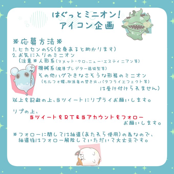 #はぐっとミニオン アイコン企画その2 前回は沢山の反応ありがとうございました! 前は締切極短だったので今回はゆっくりと…! 応募〆切:3/20 0時まで 募集人数:2名(数名増える可能性もあり) サンプルは2枚目。 応募方法は1枚目に書いてありますので、しっかりと読んでご応募お願いします!