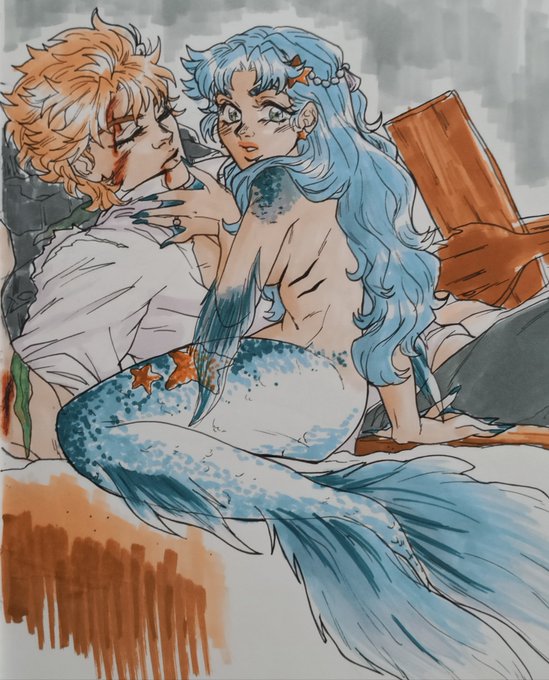 #mermay2022 day 3: Reverse roles. He saved the sailor from drowning, now the poor human it's scared. #jjba #jonathanjoestar #diobrando #jonadio #diojona #mermay