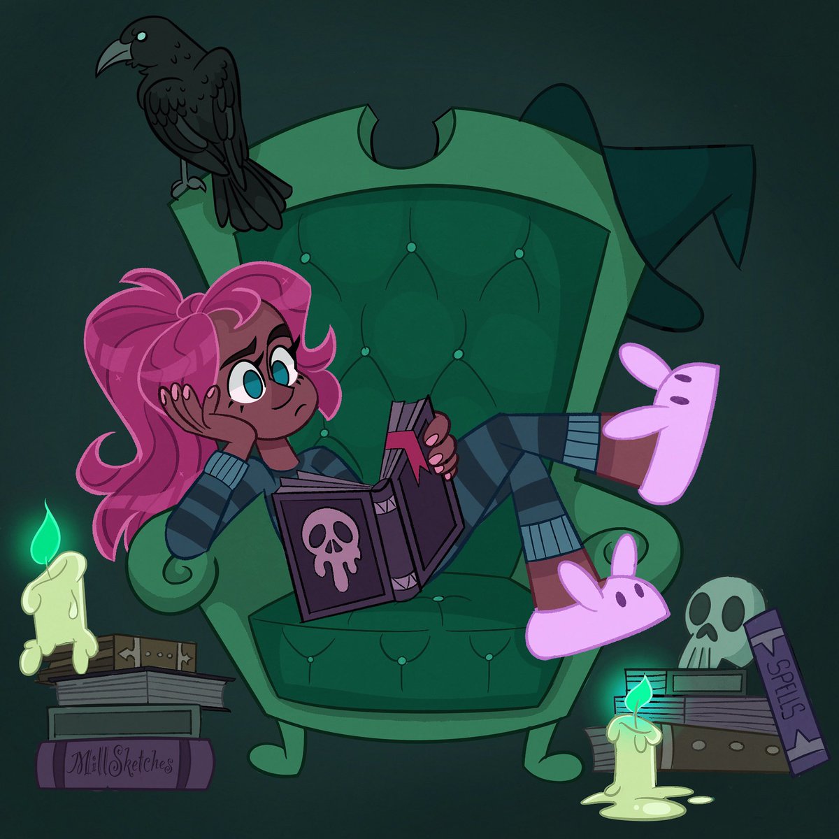 Oct. 5 - lounging and green for witches 🧙♀️ along with @thiswhimsyme Halloween prompt list for Familiars day 2. #halloween #spookyseason #inktober2020 #inktober #characterdesign #colour #spooktober #crow #pinkhair #cute