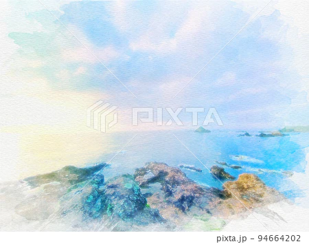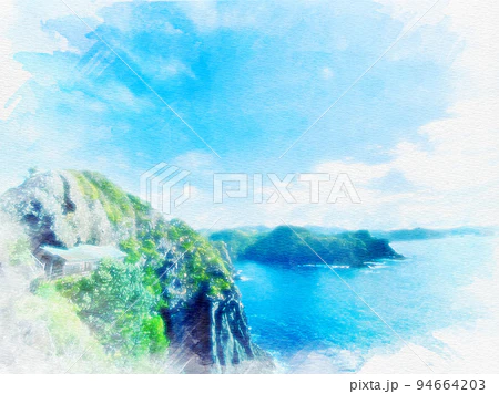 「静岡県下田市須崎の岬からの眺め」 #水彩画 #オリジナル #クリエイターさんと繋がりたい 水彩画を使いたい方はこちらからどうぞ✨↓ ※売上の10%が難民・飢餓のこども達の命を救うために寄付されます✨ pixta.jp/f/Hiromi0525/p…