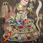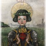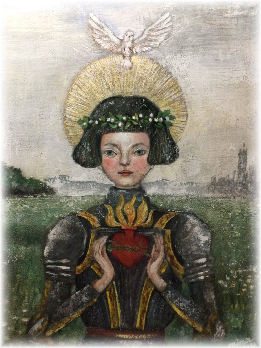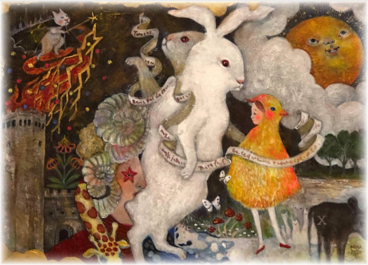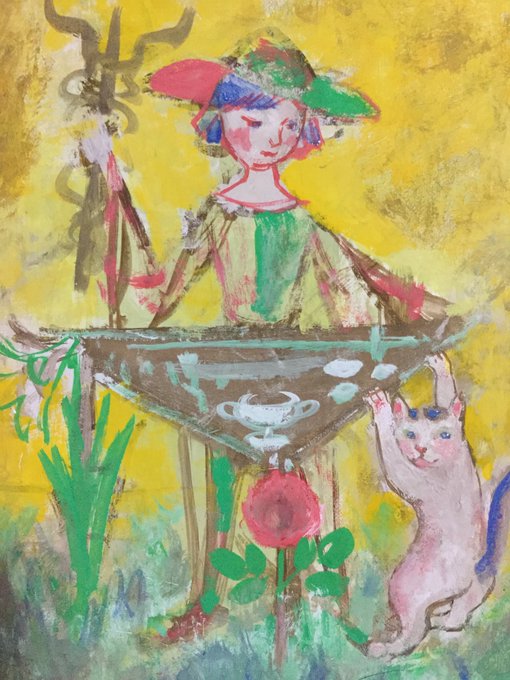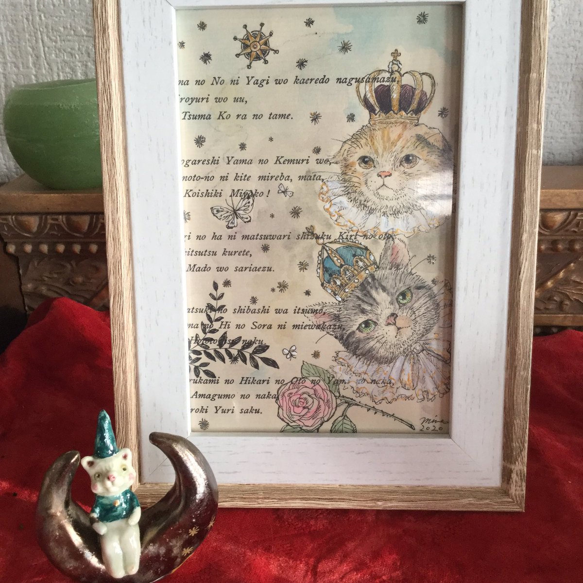 お迎え待ちの姫 この子も二ヶ月前に描きました。 赤いドレスが金魚を想わせます。 人間になった金魚姫は 王子様を助けにユニコーンや精霊たちを従えて 森を駆け抜けて行きます。 額は王家の紋章がついた一点物の額造さんの額に波紋の模様を施しました。 #コルメキッサ #金魚たちの見る夢は