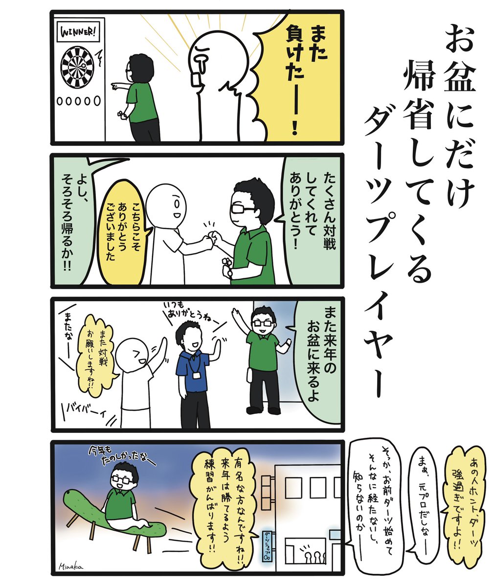 お盆最終日🍆🥒 という事で、納涼ダーツイラスト&4コマ新作描いてみました🎯お盆にだけ遊びに来てくれるあの人は…??👻最後はちょっとほっこりしてもらえたら嬉しいです😊 #イラスト #ダーツ twitter.com/MinakaSweet/…