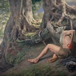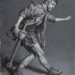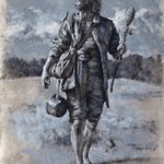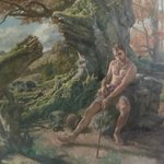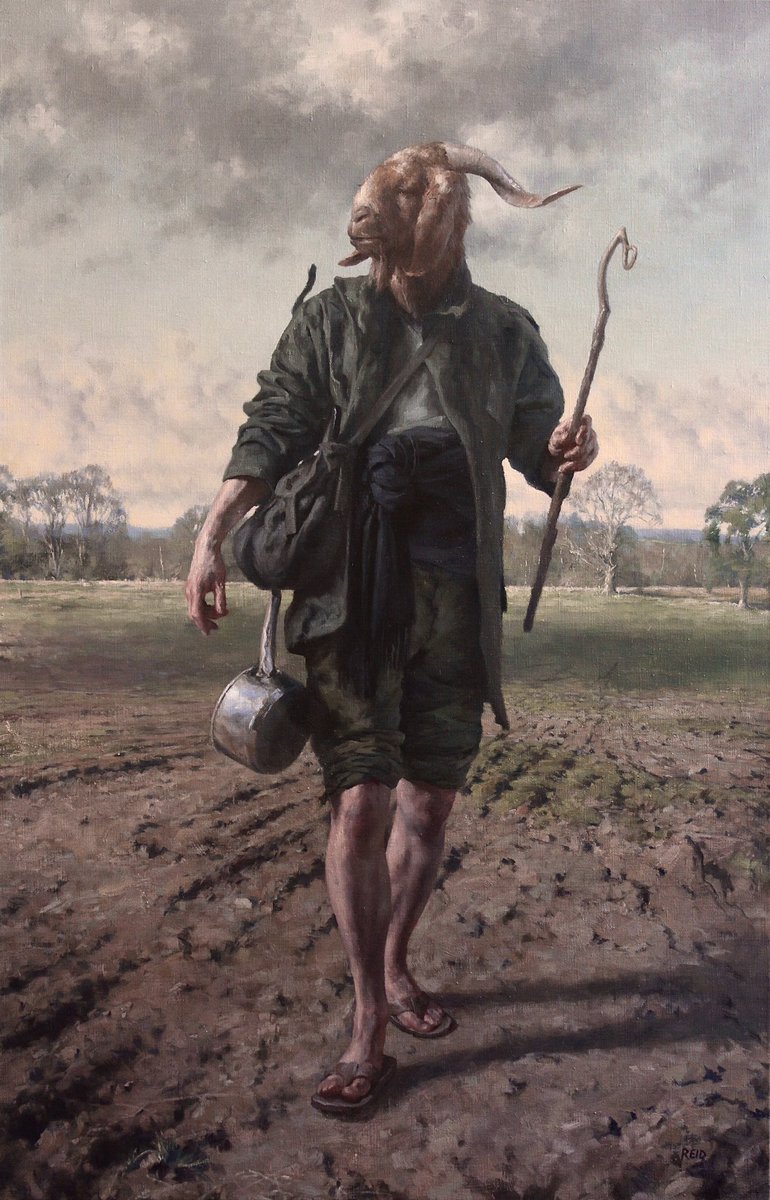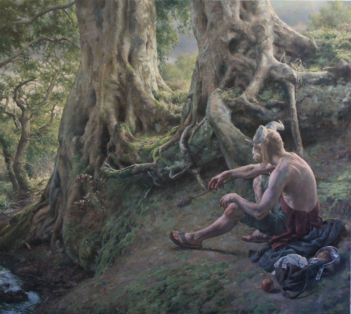 Study vs Final. ‘Pan as Wanderer’. A weird little oil painting of Pan in modern garb as a kind of wandering vagrant traipsing through the fields. He holds a shepherd’s crook-symbol of his role as protector of shepherds and their flocks.