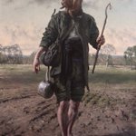 65 374 Study vs Final. ‘Pan as Wanderer’. A weird little oil painting of Pan in modern garb as a kind of wandering vagrant traipsing through the fields. He holds a shepherd’s crook-symbol of his role as protector of shepherds and their flocks. 23/08/22 21:29