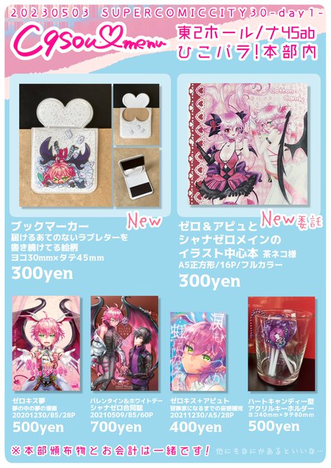 5/3スパコミday1 ひこパラ本部(東2ナ45ab)内c9souのお品書きです。本部としての頒布物とは別途ご案内する旨ご了承頂けましたら幸いです。新作グッズと既刊の他に茶ネコ様の夢魔ズ&シャナゼロのフルカラー本を委託します❣よろしくおねがいします! #20230503ひこパラお品書き