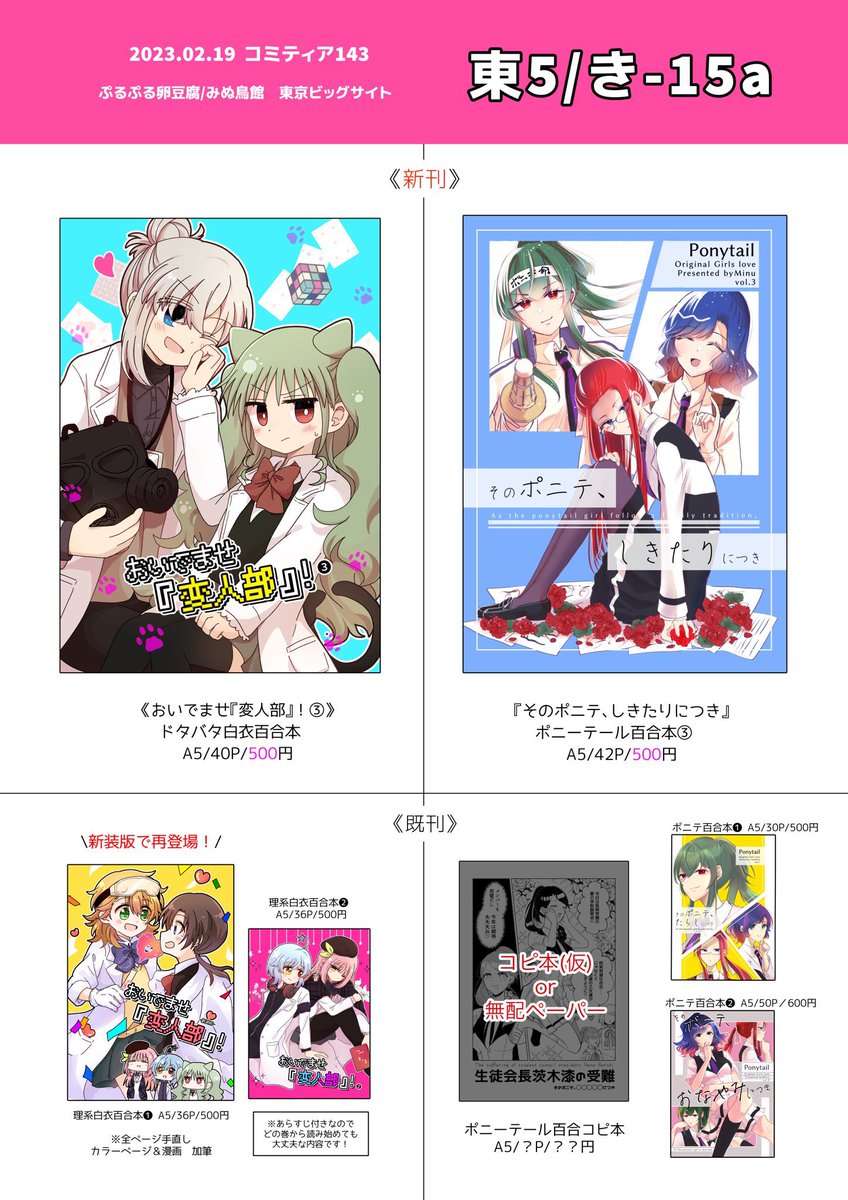 お品書きです!わたげさん(@watage_original )が作ってくださりました!2人で出ます〜当日はよろしくお願いします😎 過去のコピ本は持っていきますが卓には置いてないかもです。新しいコピ本は今から間に合えばあります!汗 #COMITIA143 #コミティア143 #創作百合