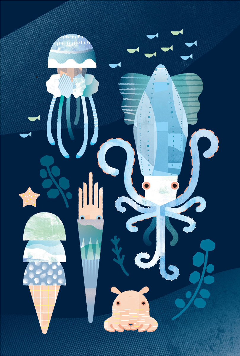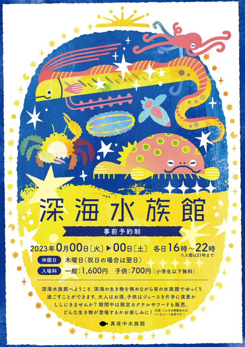 水族館のポスターを制作しました🐟🐡🐙 (妄想です!) 深海生物を愛でる夜の水族館が、あればいいな・・・ 2枚目は文字無しバージョン。 #私はこんな仕事がしたい #関係者に届くまでツイートされ続けると聞いて