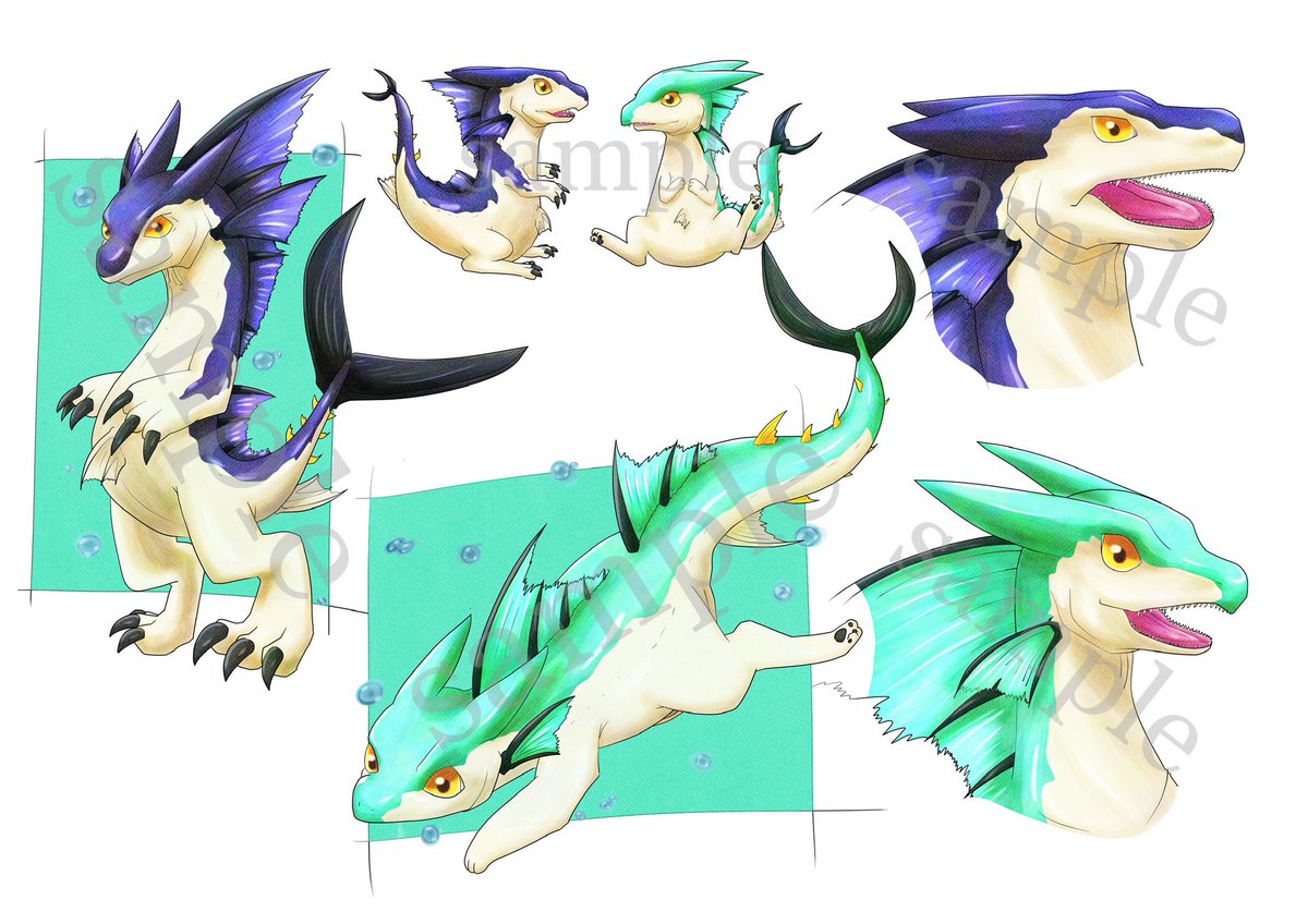 「魚竜:マグロリュウ」 ちょっとしたキャラクター設定🐟 マグロのような竜、紺色の方はオス、緑っぽい青はメス。 泳ぎは早く、急には止まれない! 🐟肉食 次はマグロリュウのアイコン風を制作しようかな #イラスト