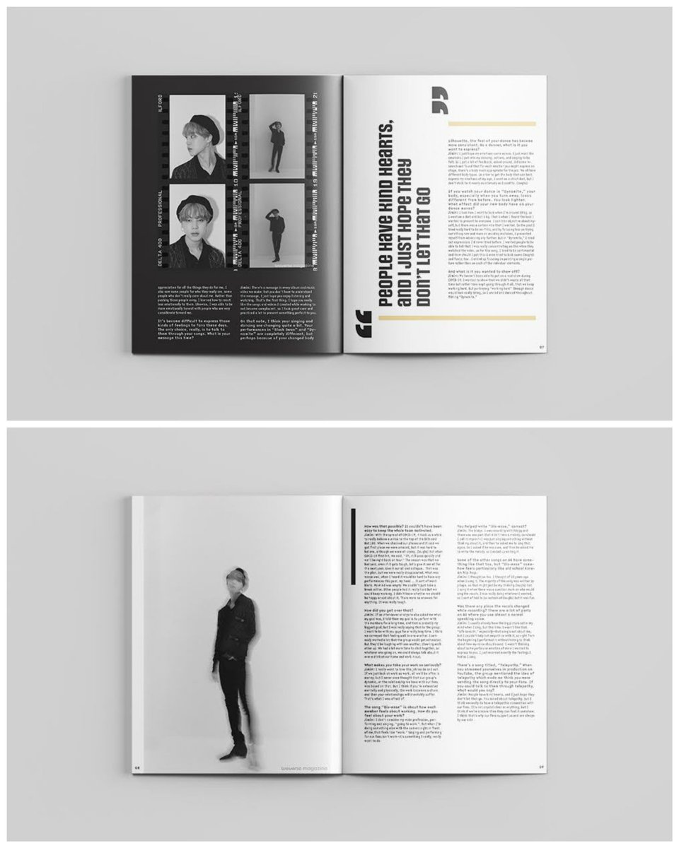 Magazine layout for Jimin's weverse interview, if it was actually printed. I really liked the interview and photos and wanted to make a fan edit #btsfanart #BTSedits #GraphicDesign Text and photos belong to @BigHitEnt magazine.weverse.io/bridge/en/56