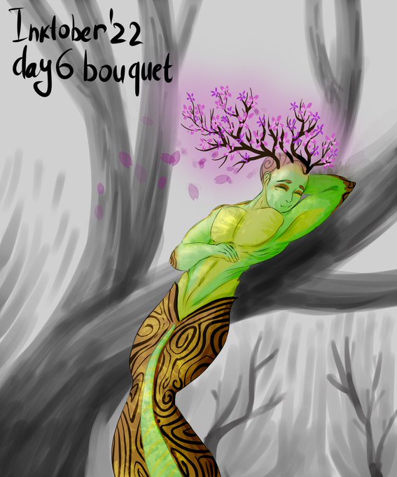 #inktober day 6! Green Driad boy resting while his flower crown #bouquet is blooming! #inktober2022 #art #digitalart #illustration #monsterboy #driad #tree