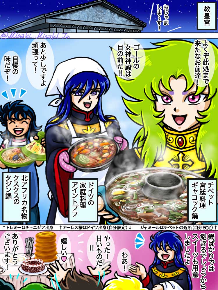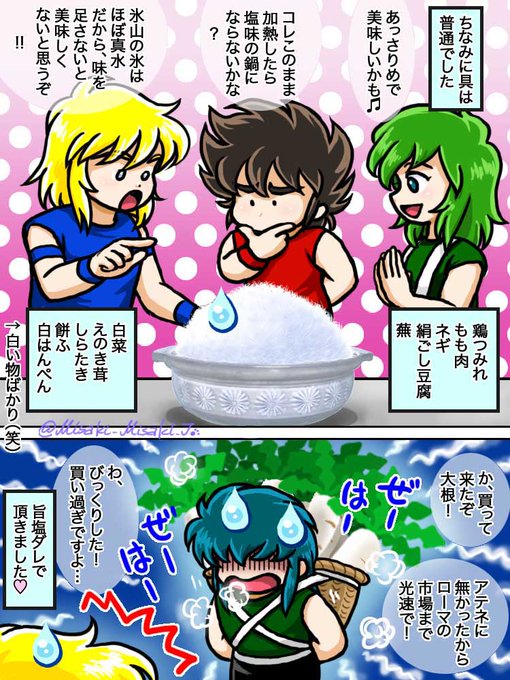 #みなさん2年前の今頃はどんな絵描いてましたか 「描く予定のない漫画を1ページで」というのを描いていました。 1. 子蟹と黒サガ(無印) 2. テネオの選択(LC) 3. マオマオの危機(DW) そして診断メーカーネタで 4. アーレス様は団子柄パンツを履いていました 1と4の温度差よ…😅