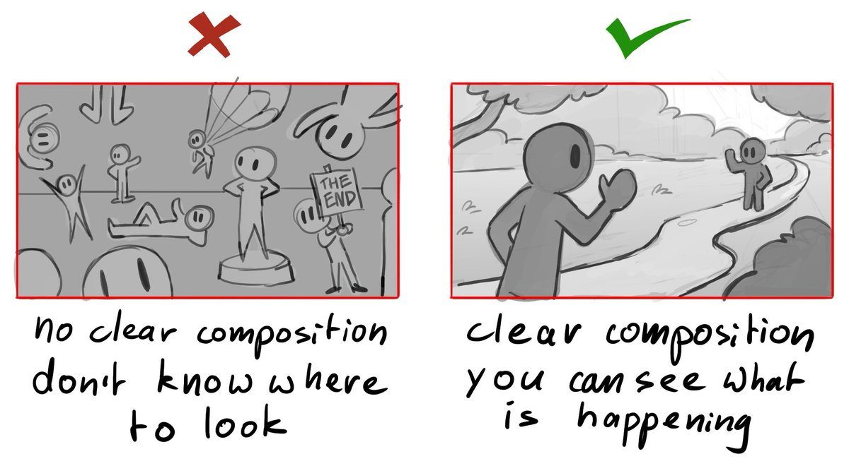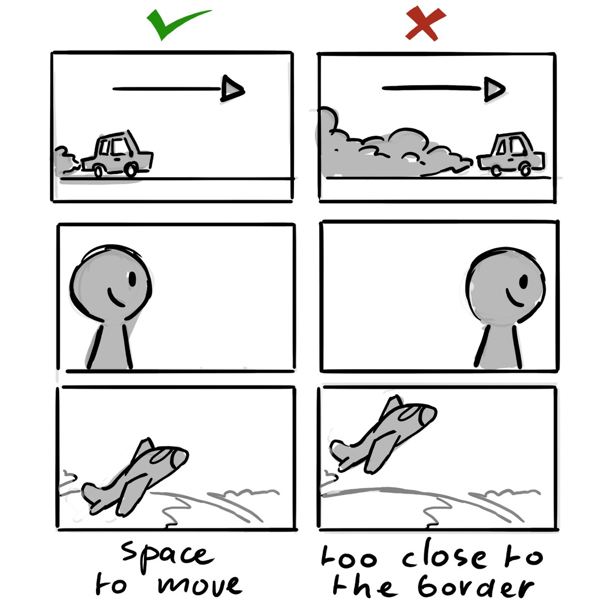Give the thing you draw space to move. Thing about the placement. Sometimes you want to bend the rules. But think about what you are trying to tell! 5/7