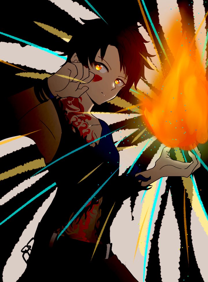 pixivSketchで下描きした男の子の完成(限界)版 (制作時間は9時間ぐらい) お目目と背景とおへそ回りは色塗り下手なりに頑張ったと思う…! お気に入りは赤い痣です! #アイビスペイント #オリキャラ