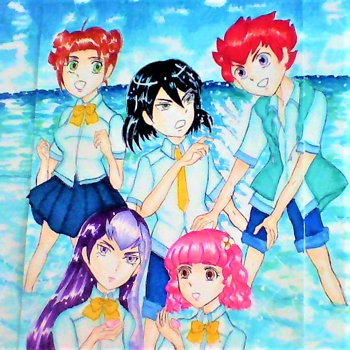 #2年3組ハーネスの日 タグお借りします。 夕暮れ時のカモメ公園でギンジロウスペシャルココアを飲むハーネスのみんなを描きました。