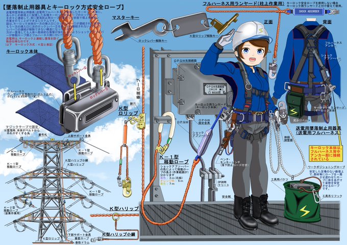 送電線 なかなか伝わらないお話 2022年1月2日以降は必ずハーネス安全帯を着用しなければなりません 現行の安全帯は使用不可⤵︎ キーロック方式安全ロープとの併用を考慮した送電線作業用のフルハーネス。 今後、鉄塔作業される方の装備を描いてみました(藤井電工さんのHPより #送電線 #模写 twitter.com/Mixed_By_kao/s…