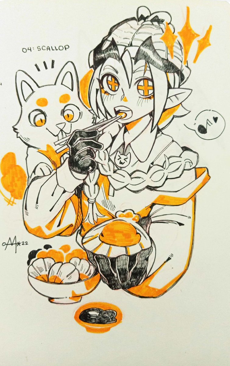 Day 04: Scallop. Anxiety the connoisseur of meals, her favorite? Scallops! #inktober2022 #Inktober #art